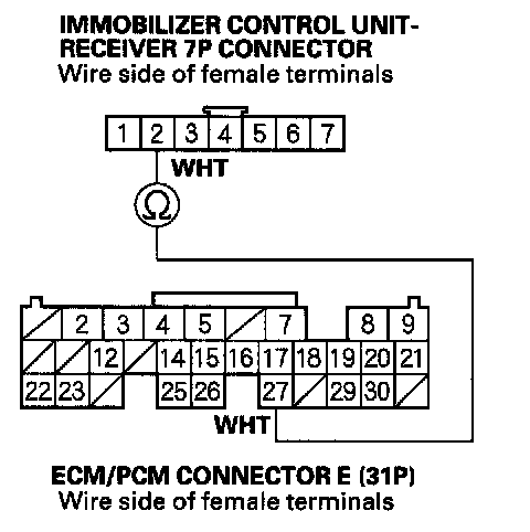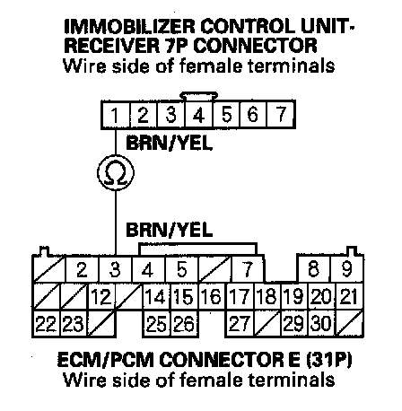 25. Check for continuity between the immobilizer control unit-receiver 7P connector No. 1 (LG3) terminal and ECM/PCM connector E (31P) No. 3 terminal.