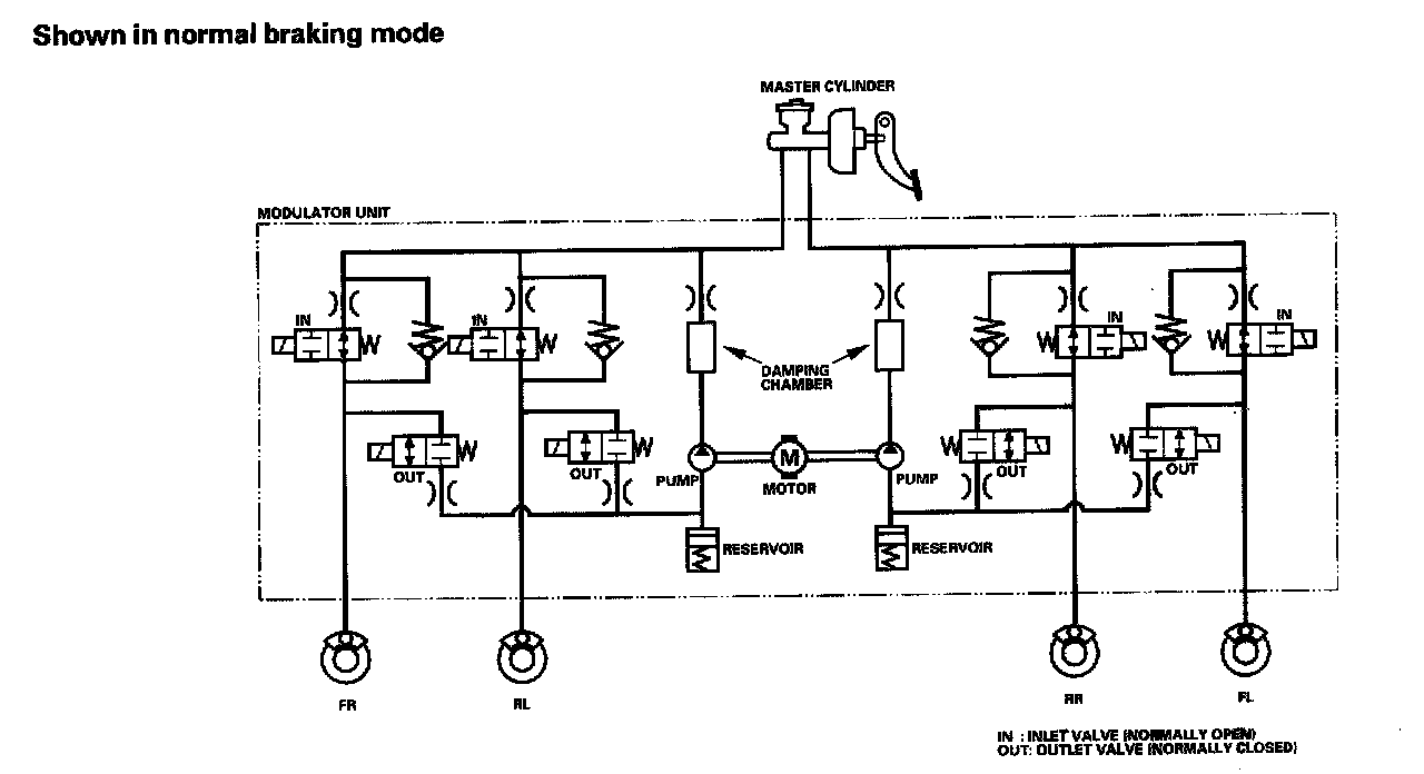 Normal braking mode: Inlet valve open, outlet valve closed: Master cylinder fluid is pumped out to the caliper.