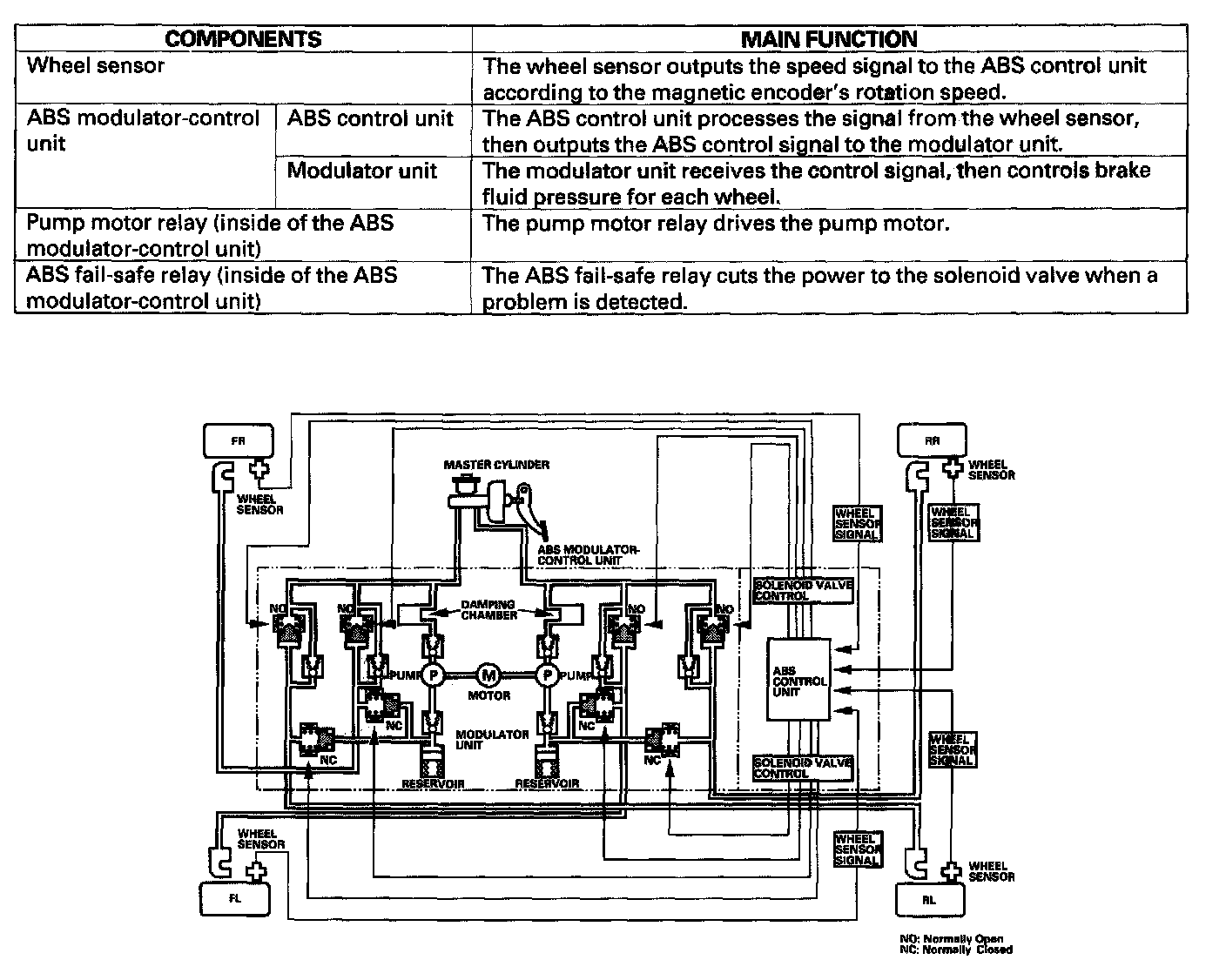 The ABS modulator consists of inlet solenoid valves, outlet solenoid valves, reservoir, pump, and the pump motor. The modulator reduces the caliper fluid pressure directly. It is a circulating-type modulator because the brake fluid circulates through the caliper, reservoir, and the master cylinder. The hydraulic control has three modes: Normal braking, pressure retaining, and pressure reducing. The hydraulic circuit is an independent four channel type, one channel for each wheel.