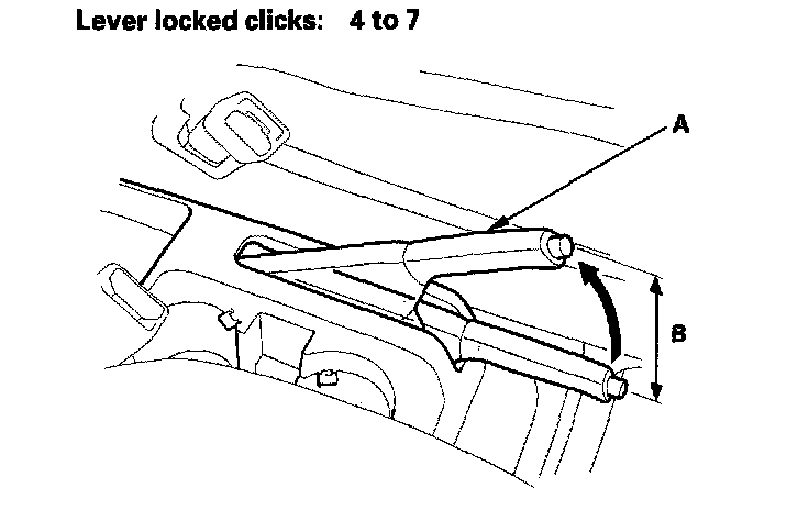 1. Pull the parking brake lever (A) with 196 N (20 kgf, 44 lbs.) of force to fully apply the parking brake. The parking brake lever should be locked within the specified number of clicks (B).
