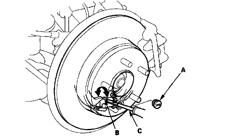 7. Turn the adjuster (B) with a flat-tip screwdriver (C) until the shoes lock against the drum. Then back off 8 clicks, and install the access plug.