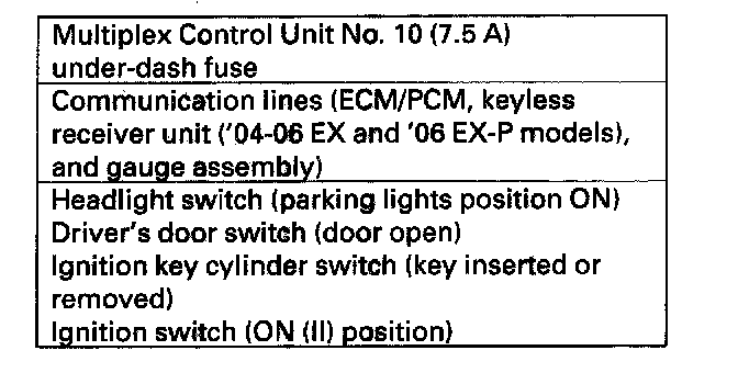 When the ignition switch is turned ON (II), the multiplex control unit, gauge assembly, and ECM/PCM wake up at the same time without "talking" to each other through the communication tines. When any switch in the multiplex system is turned on, it wakes up its related control unit which, in turn, wakes up the other units.