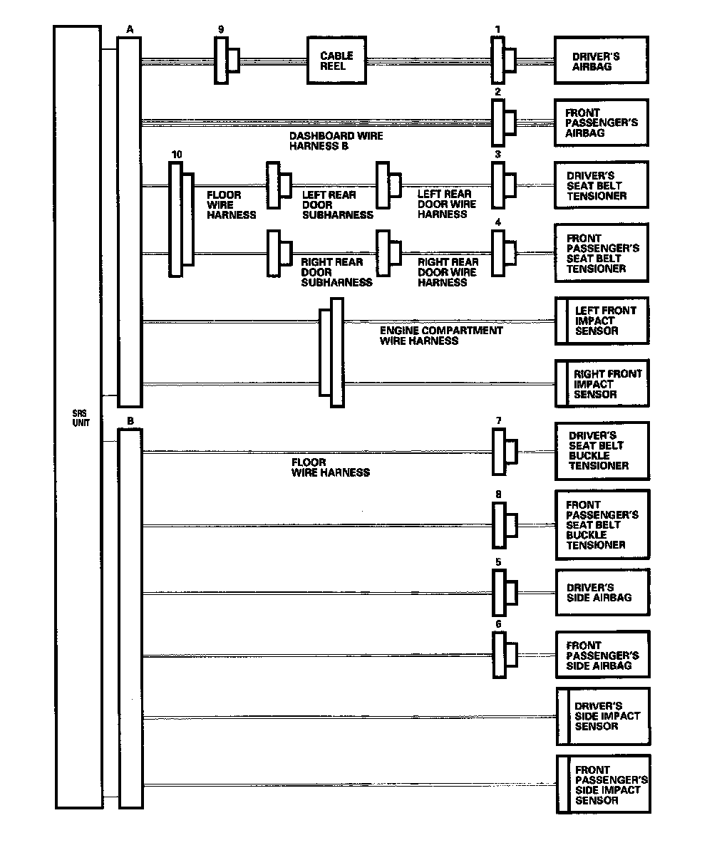 - Before disconnecting SRS unit connector B from the SRS unit, disconnect both side airbag 2P connectors (5, 6), and both seat belt buckle tensioner 4P connectors (7, 8).