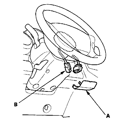 2. Remove the access panel (A) from the steering wheel, then disconnect the driver's airbag 4P connector (B) from the cable reel.