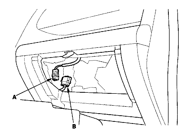 3. Remove the glove box, then disconnect the front passenger's airbag 4P connector (A) from dashboard wire harness B.