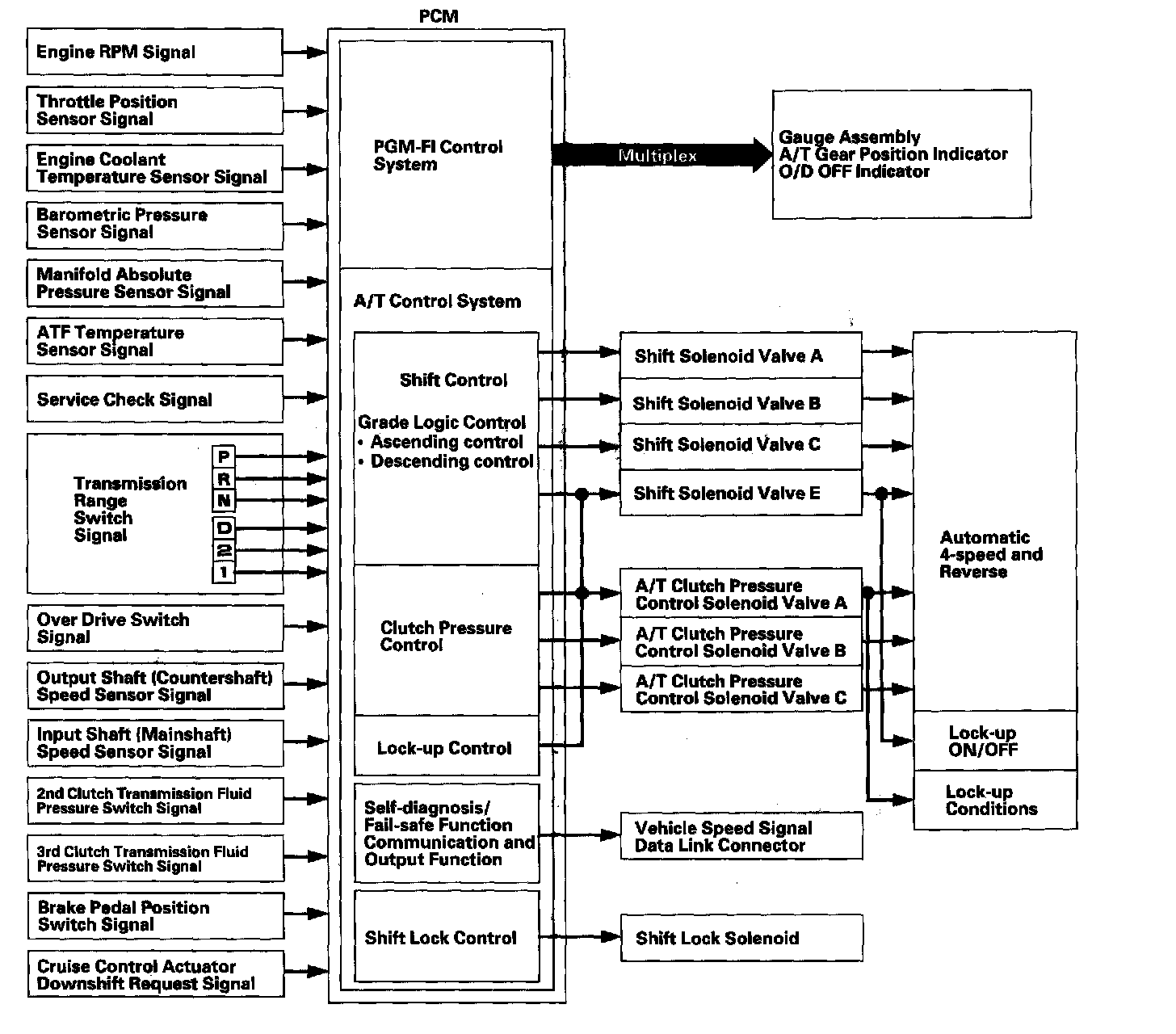 The PCM receives input signals from the sensors, switches, and other control units, processes data, and output signals for the engine control system and A/T control system. The A/T control system includes shift control, grade logic control, clutch pressure control, and lock-up control. The PCM activates the shift solenoid valves and the A/T clutch pressure control solenoid valves to control shifting transmission gears and lock-up torque converter clutch.