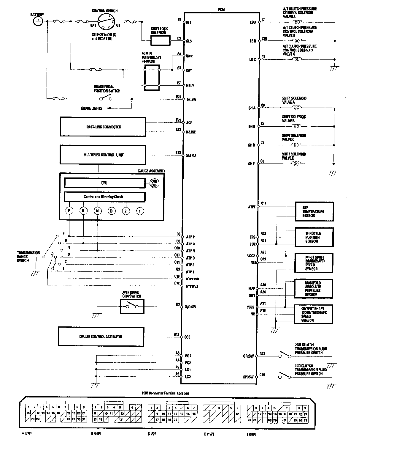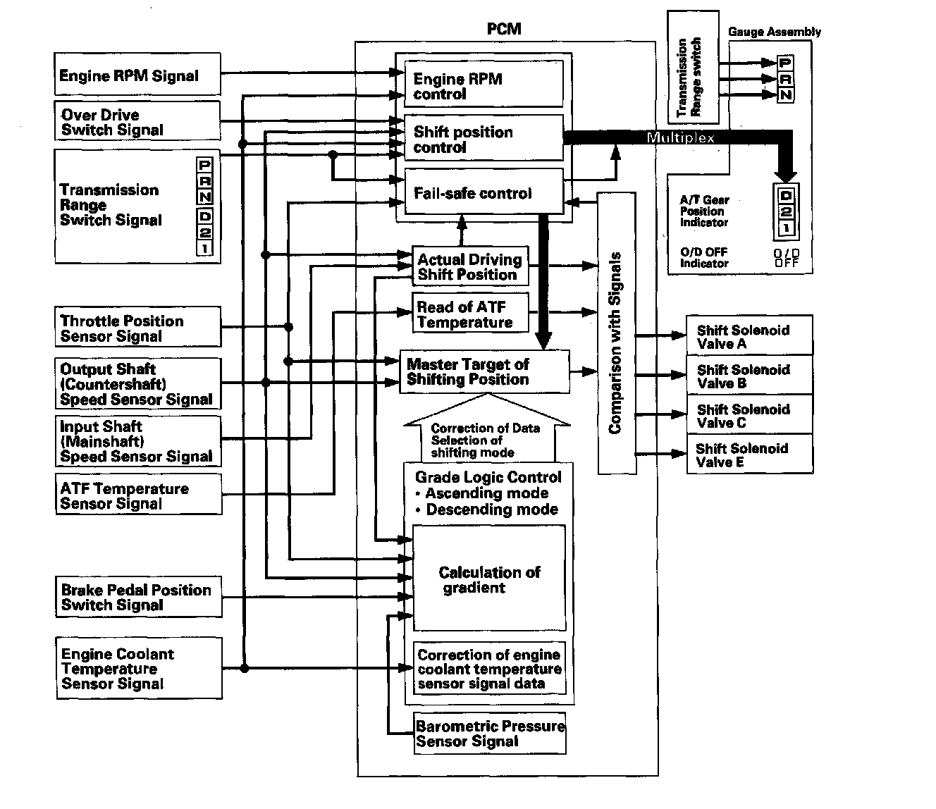 Also, a grade logic control system has been adopted to control shifting in the D position. The PCM compares actual driving conditions with memorized driving conditions, based on the input from the throttle position sensor, the engine coolant temperature sensor, the barometric pressure sensor, the brake pedal position switch signal, and the shift lever position signal, to control shifting while the vehicle is ascending or descending a slope.