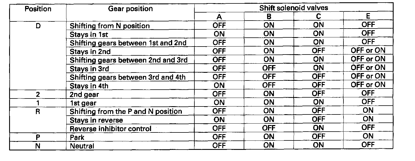 The PCM turns the shift solenoid valves A, B, C, and E ON and OFF to control shifting of the transmission. The combination of driving signals to shift solenoid valves A, B, C, and E are shown in table.