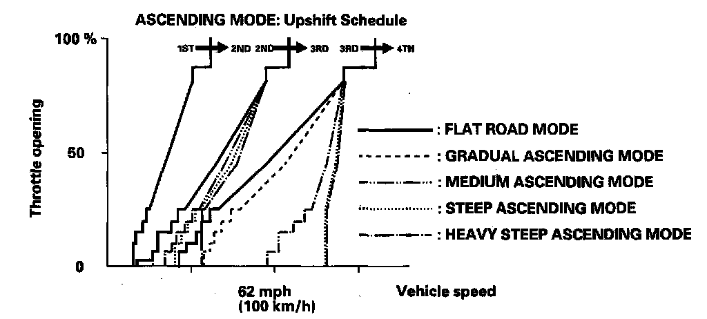 When the PCM determines that the vehicle is climbing a hill in the D position, the system extends the engagement area of 2nd and 3rd gears to prevent the transmission from frequently shifting between 2nd and 3rd gears, and between 3rd and 4th gears, so the vehicle can run smooth and have more power when needed. Shift schedules stored in the PCM between 2nd and 3rd gears, and between 3rd and 4th gears, enable it to automatically select the most suitable gear according to the magnitude of a gradient.