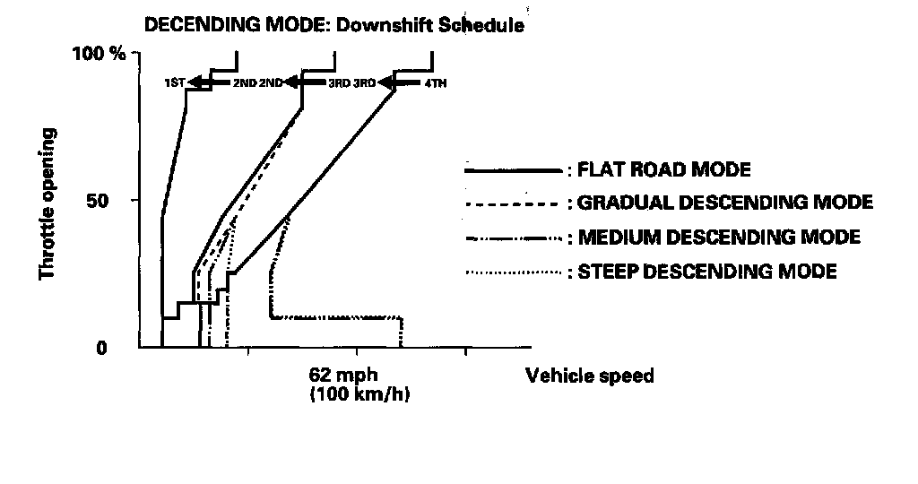 When the PCM determines that the vehicle is going down a hill in the D position, the shift-up speed from 3rd to 4th gear, and from 2nd to 3rd gear (when the throttle is closed) becomes higher than the speed for flat road driving to widen the 3rd gear and 2nd gear driving area. This, in combination with engine braking from the deceleration lock-up, achieves smooth driving when the vehicle is descending. There are three descending modes with different 3rd gear driving areas and 2nd gear driving areas according to the magnitude of a gradient stored in the PCM. When the vehicle is in 4th gear, decelerating, and when you are applying the brakes on a steep hill, the transmission will downshift to a lower gear. When you accelerate, the transmission will then return to a higher gear.