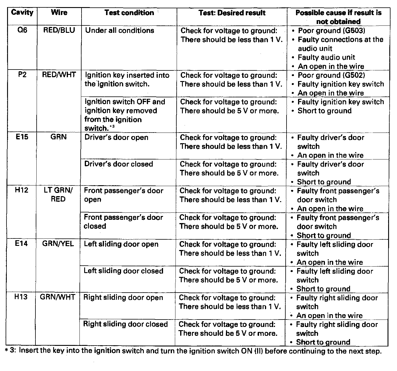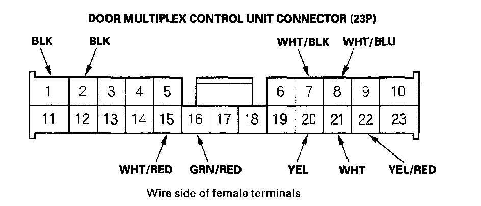 24. Reconnect the connector to the door multiplex control unit. Turn the ignition switch ON (II) and make these input tests at the connectors.