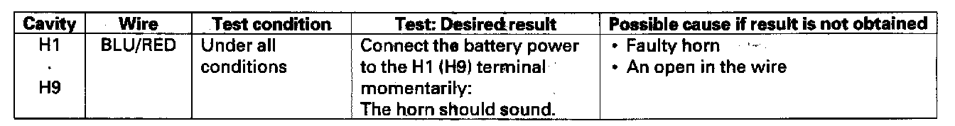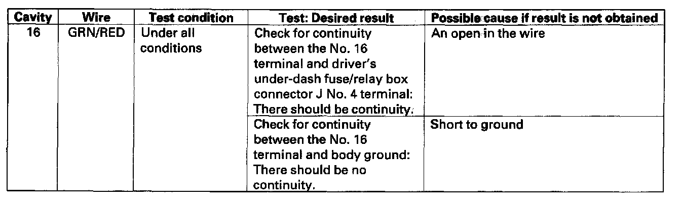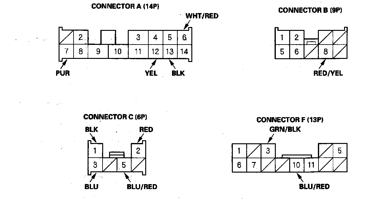 6. Reconnect all connectors to the driver's under-dash fuse/relay box. Turn the ignition switch ON (II), and make these input tests at the appropriate connectors on the driver's under-dash fuse/relay box.