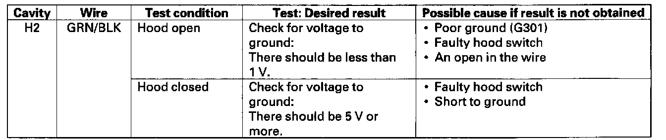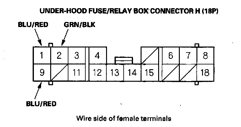 18. Reconnect the connector to the under-hood fuse/relay box, turn the ignition switch ON (II) and make the input test at the appropriate connector on the under-hood fuse/relay box.