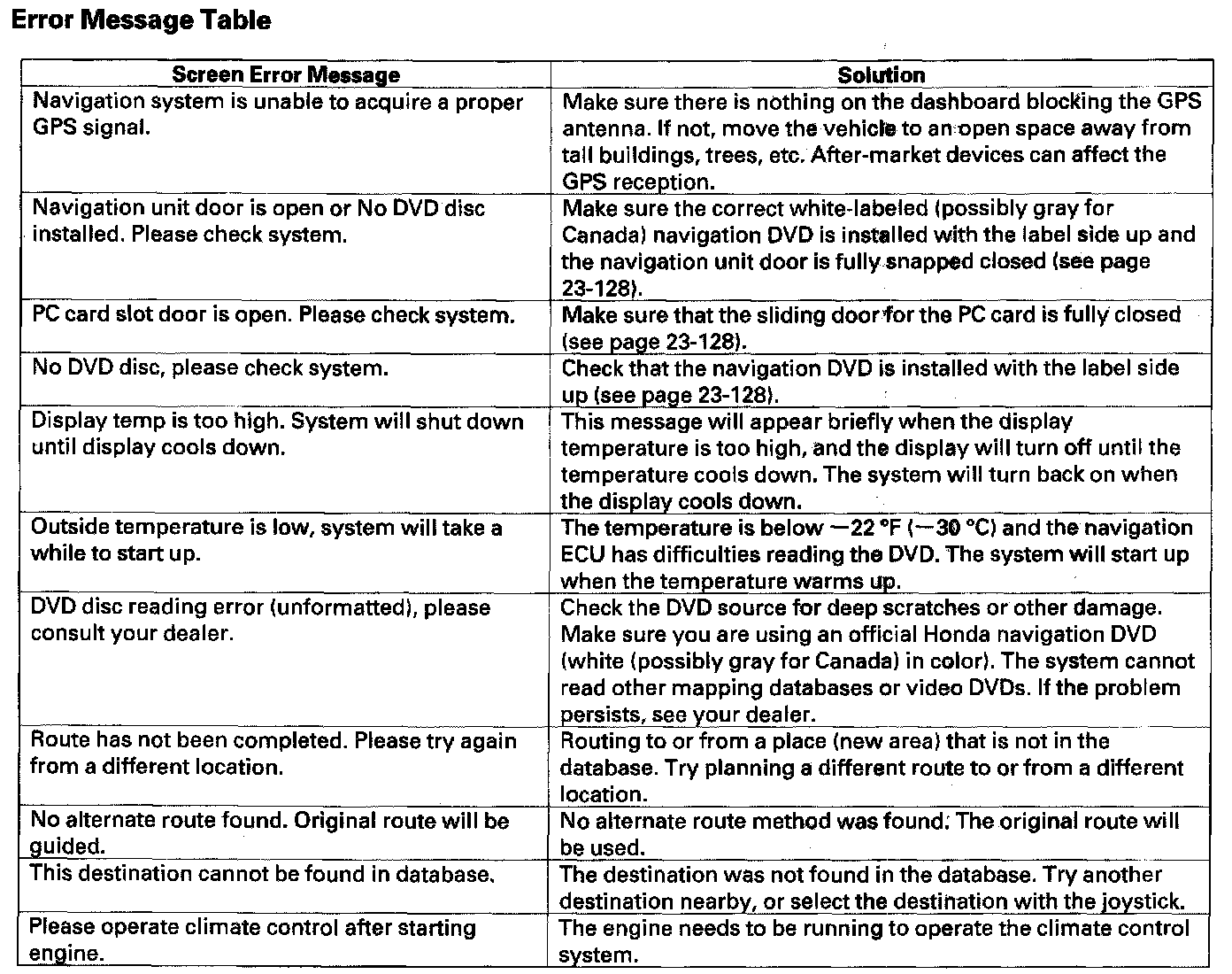 Error Message Table
