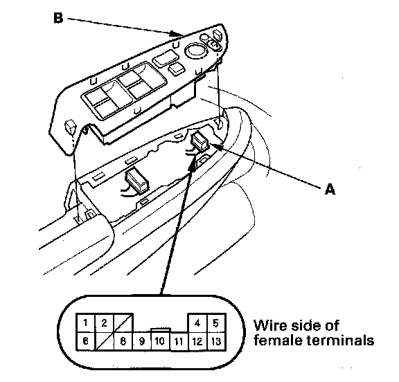 2. Disconnect the 13P connector (A) from the power mirror switch (B), and inspect the terminals. If OK, go to step 3.