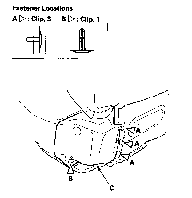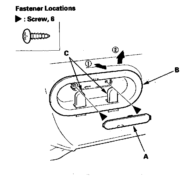 14. Pry up the cushion utility hook cap (A) and remove the screws, then remove the cushion utility hook trim (B) from the cushion utility hooks (C).