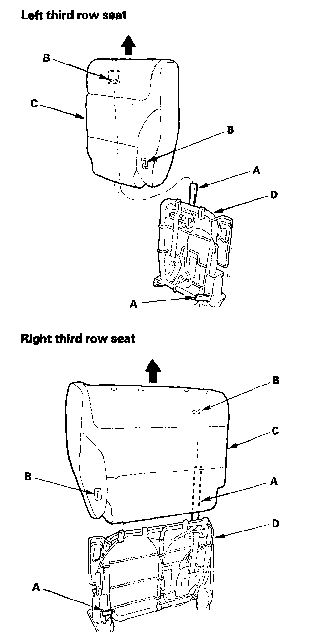 12. Pass the straps (A) in the seat-back cover through each slots (B), then remove the seat-back cover/pad (C) from the seat-back frame (D).