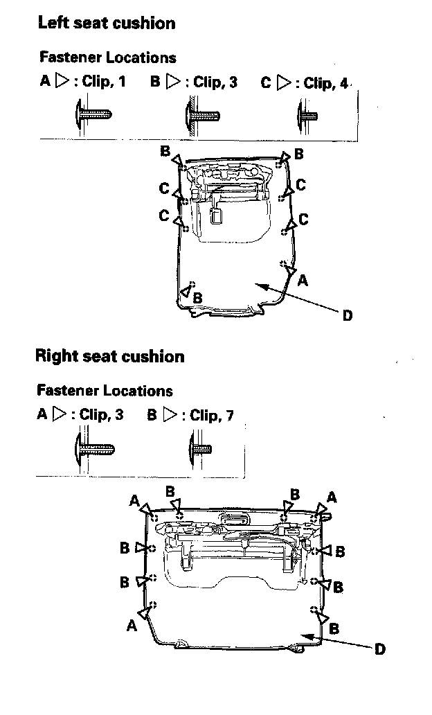 17. Release the clips (A, B, C). Remove over the seat cushion mat (D).