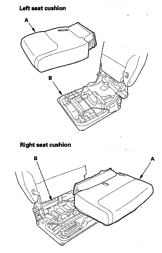 19. Remove the seat cushion cover/pad (A) from the cushion frame (B).