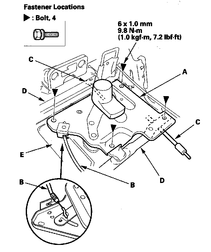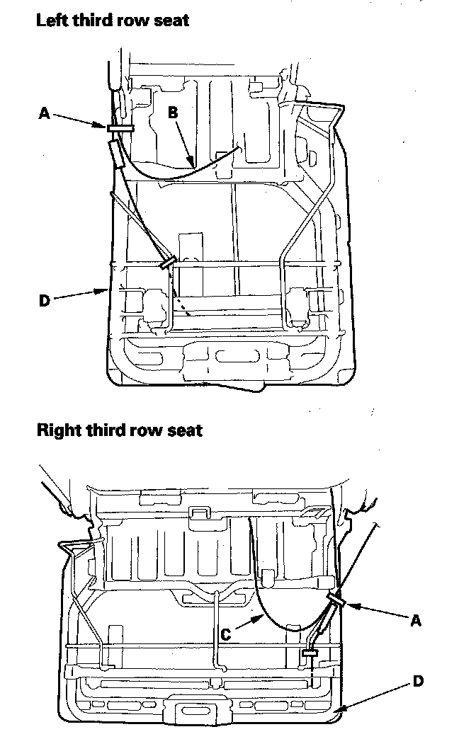 11. Left third row seat: Remove the bolts (A, B) and bushing (C), then separate the seat-back (D) and seat cushion (E). Take care not to kink the cables.