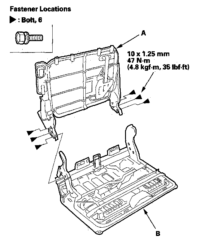 23. Remove the bolts, then separate the right seat-back frame (A) and right seat cushion frame (B).