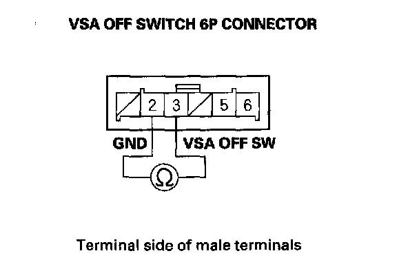 3. Check for continuity between the VSA OFF switch 6P connector terminal No. 2 and No. 3. There should be continuity when the switch is pressed, and no continuity when the switch is released.