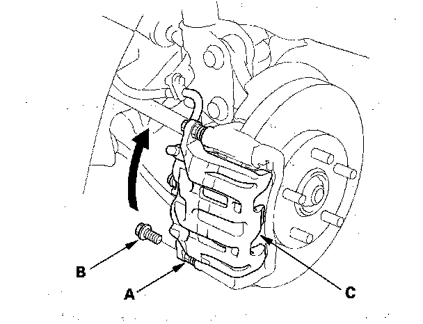 3. While holding the caliper pin (A) with a wrench, remove the flange bolt (B). Be careful not to damage the pin boot. Then pivot the caliper (C) up out of the way. Check the hose and pin boots for damage and deterioration.