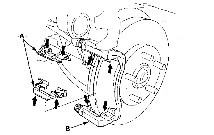 3. Check the thickness of the inner pad (A) and outer pad (B). Do not include the thickness of the backing plate.