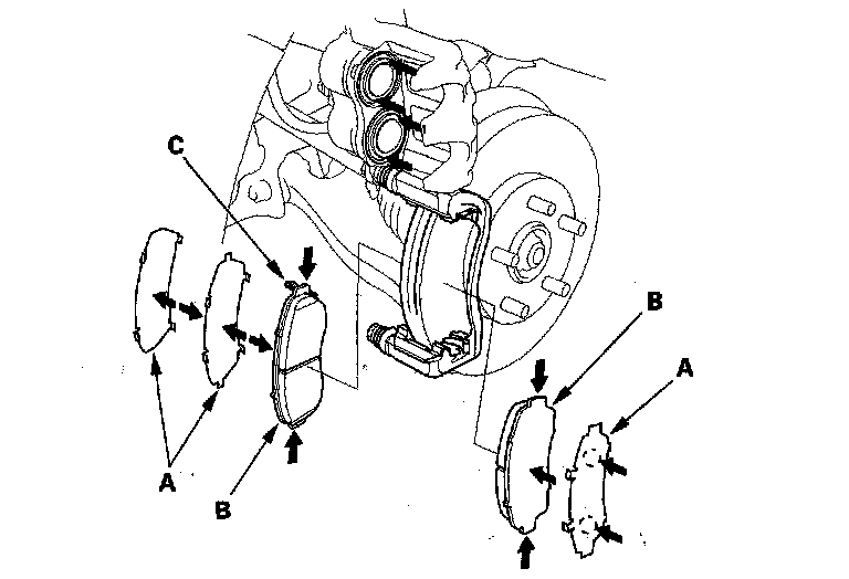 11. Install the brake pads and pad shims correctly. Install the brake pad with the wear indicator (C) on the inside. If you are reusing the brake pads, always reinstall the brake pads in their original positions to prevent a loss of braking efficiency.