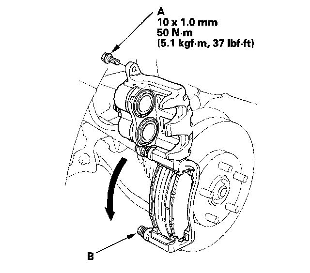 15. Pivot the caliper down into position. Install the flange bolt (A), and torque it to the specified torque while holding the caliper pin (B) with a wrench. Be careful not to damage the pin boot.