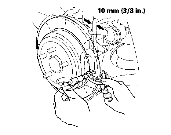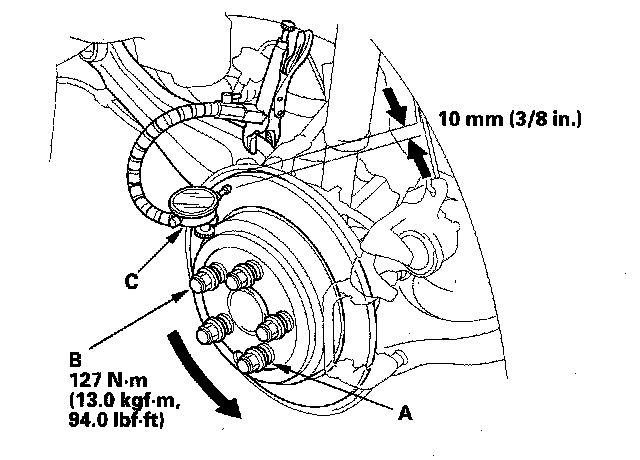 6. Set up the dial gauge (C) against the brake disc/drum as shown, and measure the runout at 10 mm (3/8 inch) from the outer edge of the brake disc.
