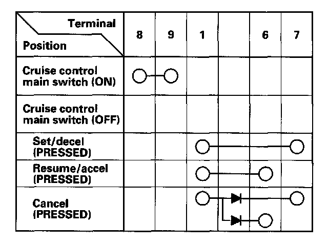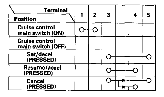 - If there is continuity, and it matches the table, but switch failure occurred on the cruise control input test, check and repair the wire harness on the switch circuit.
