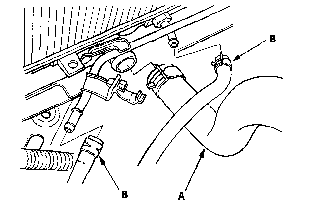 8. Remove the lower radiator hose (A) and automatic transmission fluid (ATF) cooler hoses (B). Plug the ATF cooler hoses and lines.