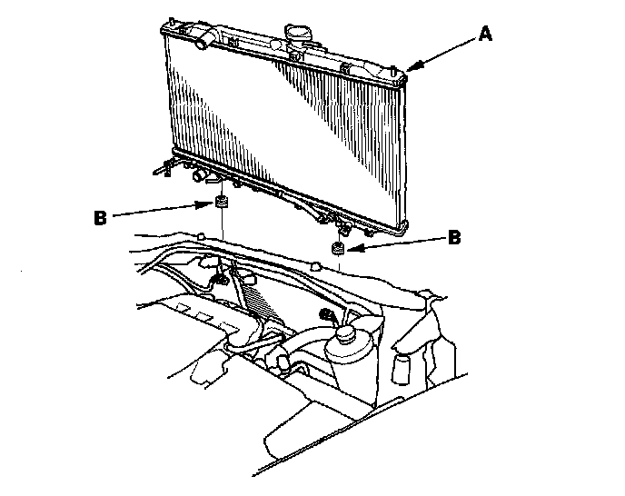 11. Pull up the radiator assembly (A), then remove the lower cushions (B).