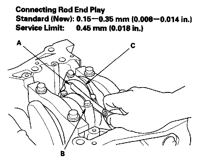 3. Measure the connecting rod end play with a feeler gauge (A) between the connecting rod (B) and crankshaft (C).