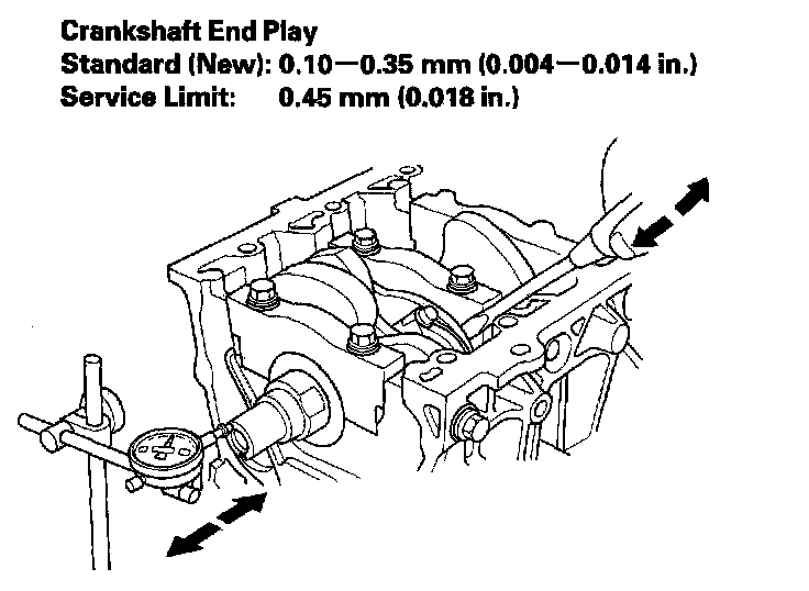 5. Push the crankshaft firmly away from the dial indicator, and zero the dial against the end of the crankshaft. Then pull the crankshaft firmly back toward the indicator; the dial reading should not exceed the service limit.