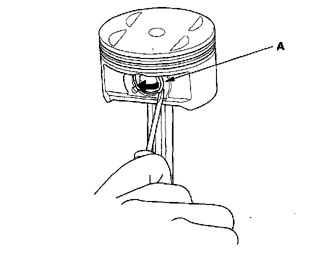 3. Remove snap rings (A) from both sides of the piston. Start at the cutout in the piston pin bore. Remove the snap rings carefully so they do not go flying or get lost, Wear eye protection.