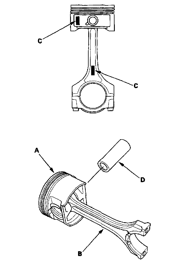 4. Assemble the piston (A) and connecting rod (B) with the embossed marks (C) on the same side. Install the piston pin (D).