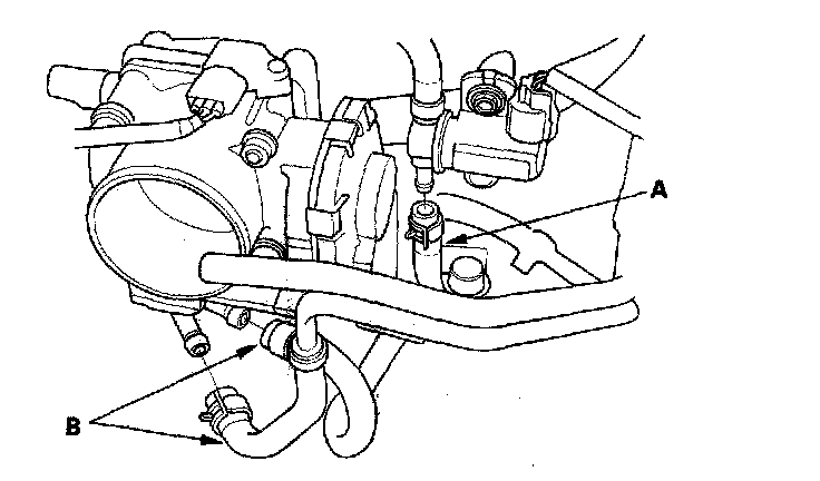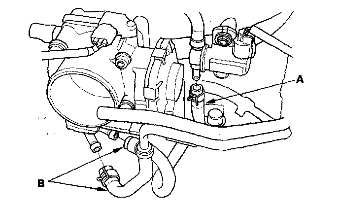 4. Remove the evaporative emission (EVAP) canister purge hose (A) and water bypass hoses (B), then plug the water bypass hoses.