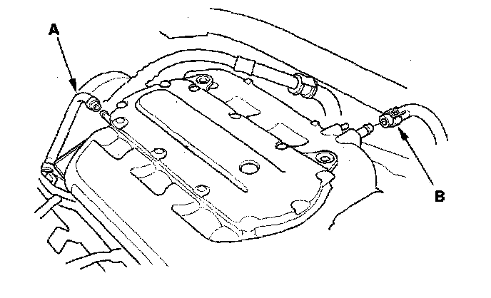 3. Remove the positive crankcase ventilation (PCV) hose (A) and brake booster vacuum hose (B).
