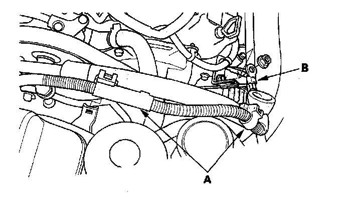 15. Remove the brake booster vacuum hose (A) and evaporative emission (EVAP) canister hose (B).