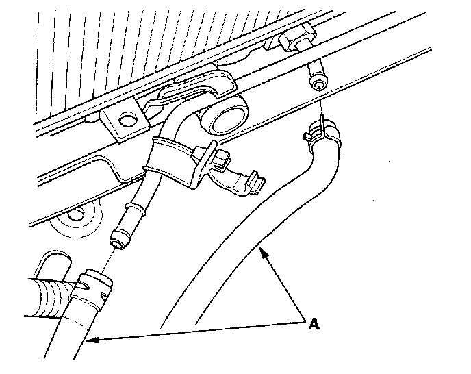 46. Remove the upper radiator hose (A) and lower radiator hose (B).