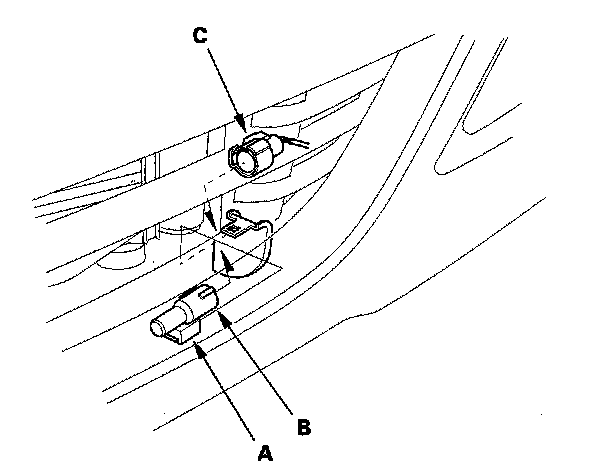 Outside Air Temperature Sensor Replacement1. Lift the tab (A) to release the lock, then remove the outside air temperature sensor (B) from the back of the front bumper beam. Disconnect the 2P connector (C) from the outside air temperature sensor.