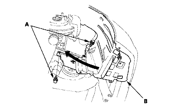 4. Remove the front splash shield. Remove the clips (A) and bolt from the right front inner fender (B). Then move the inner fender to the rear.