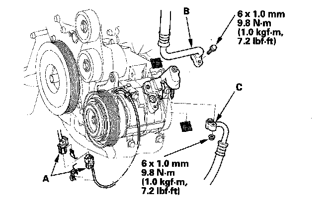 5. Disconnect the A/C compressor clutch connector (A). Remove the bolt and the nut, then disconnect the suction line (B) and discharge line (C) from the A/C compressor. Plug or cap the lines immediately after disconnecting them to avoid moisture and dust contamination.