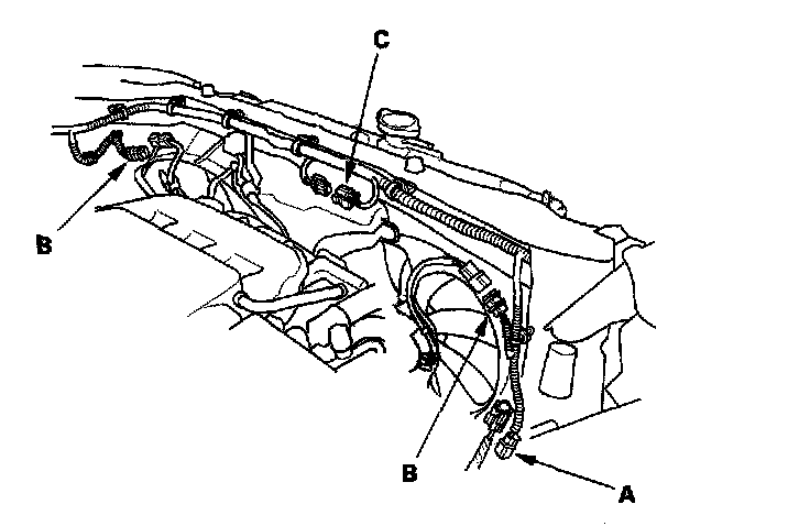 7. Disconnect the A/C compressor clutch connector (A) and fan motor connectors (B).