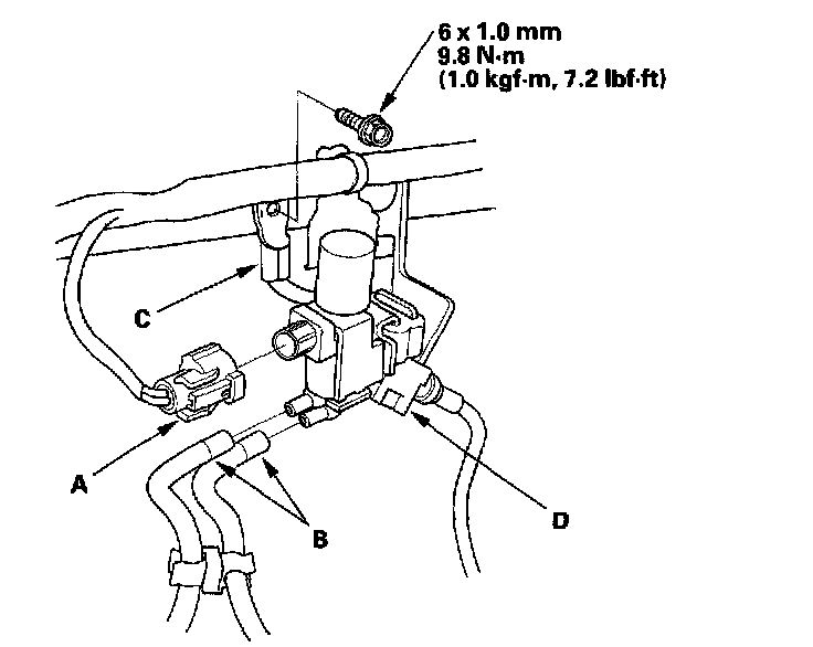 9. J35A6 engine: Disconnect the engine mount control solenoid valve connector (A) and vacuum hoses (B).