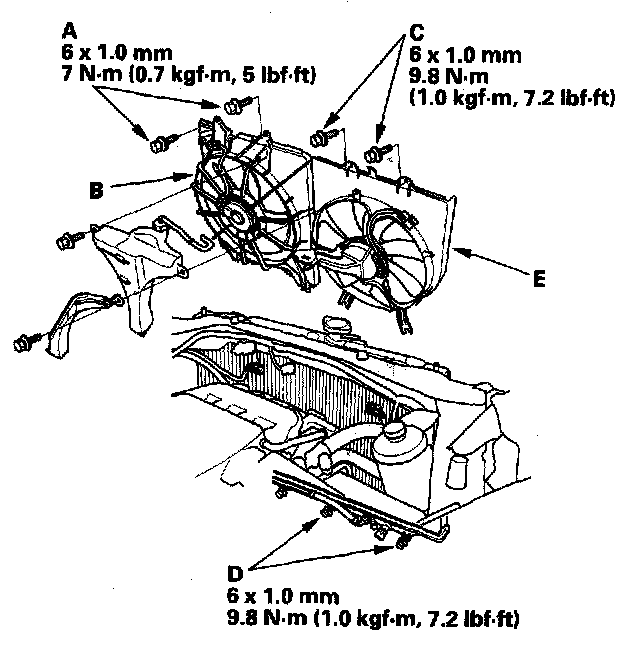 Radiator and A/C Condenser Fan ReplacementNOTE: Use fender covers to avoid damaging painted surfaces. To avoid damaging the wires and terminals, unplug the wiring ring: connectors carefully while holding the connector portion. Mark all wiring and hoses to avoid misconnection. Also, be sure that they do not contact any other wiring or hoses, or interfere with any other parts.