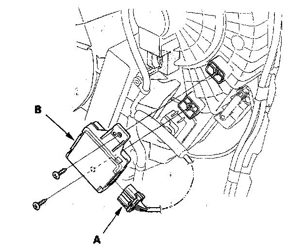 2. Disconnect the connector (A) from the rear climate control unit (B), then remove the self-tapping screws and the rear climate control unit.