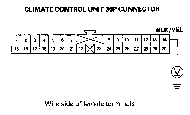 4. Measure the voltage between the No. 14 terminal of the climate control unit 30P connector and body ground.